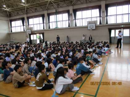 今年度になって初めて体育館に全校児童が集まりました。今日は人権朝会を行いました。目の前に子どもたちの顔や反応が見れるのは、やはりいいものです。やりがいがあります。