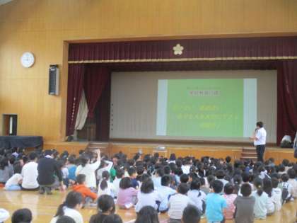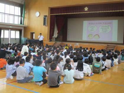 全校児童が体育館に集まって校長先生から話を聞いたり、絵本の読み聞かせをしてもらったりして自分や人を大切にする事について考えました。特に読み聞かせは「とんでもない」という絵本から自分や友だちの良さに気づく機会になったのではと思っています。自分や人の良い所にたくさん気づき、学校教育目標にもある『学び合い 高め合い 自分も人も大切にできる明親の子』になってほしいと願っています。