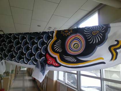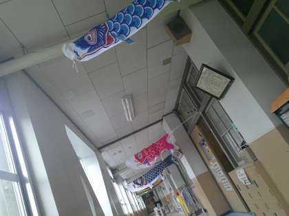 『屋根よ〜り 高い 鯉のぼり〜♪』 職員室前の廊下に鯉のぼりが登場しました!子どもの日は過ぎてしまいましたが、突然現れた鯉のぼりに子どもたちは大喜びです。廊下がパッと華やぎました。