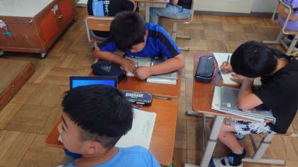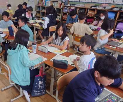 「デジタル機器と私たち」では、よりよくデジタル機器と付き合うために、気になることを調べ、提案する文章をグループ(3人組)で書きます。今日は、テーマに対する提案内容を考えました。提案のきっかけ、解決したい問題、それを受けての提案をこれからまとめていきます。