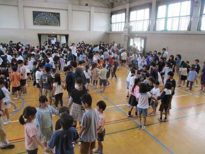 前回第1回の児童集会では、同じグループに所属している者同士で顔を合わせて自己紹介をしていましたが、今回は「U.F.Oゲーム」をいうゲームをして楽しみました。1年生を司令塔とし、1年生が指さす方向に他学年の児童が動くというものです。1年生に様々な方向に指さしされて笑顔を見せながらお兄さんお姉さんが動いていました。一緒にゲームを楽しむことでグループの仲を深めていました。