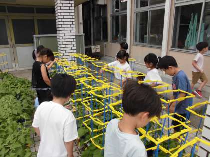 あさがおがぐんぐん育っています。先週のはじめにはつるが伸びてきていました。地面をはったり、お隣のあさがおと絡まったりしていたため、みんなでどうしたらよいか考えました。その結果「棒で支えたらいい。」「つるが絡むところをつくってあげたらいい。」というアイデアが出たため、支柱を立てることにしました。