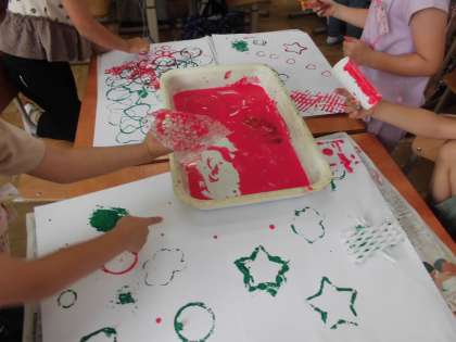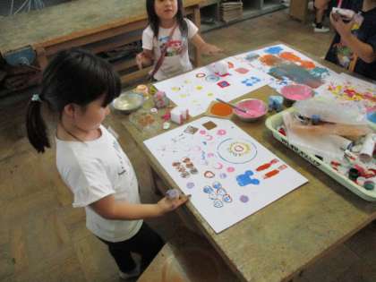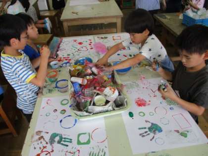 図画工作で「ぺったん ころころ」の学習をしました。みんなで集めたゼリーカップや緩衝材、紙筒、洗濯ばさみ、ペットボトルキャップなどいろいろな材料に絵の具をつけ、画用紙におしてみました。夢中でぺたぺた、ころころ・・・いつの間にか手も絵の具だらけにしながら楽しみました。いろいろな形が画用紙いっぱいに広がりました。