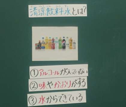 「清涼飲料水」に含まれる砂糖の量について知りました。もちろん緑茶は0gでしたが、よく飲む炭酸飲料、スポーツドリンク、果汁入りジュースには1日摂取量(20g)を超える砂糖が入っていてみんなびっくり!(担任もびっくり!)。「1本一気に飲むのはやめよう」「毎日飲むのはやめよう」といった感想を持っていました。