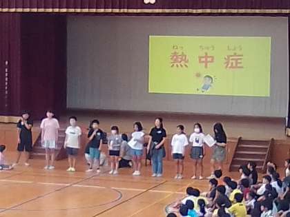 保健委員会は熱中症について発表していました。保健委員会の児童全員がスライドや実物を使って全校のみんなに分かりやすく発表してくれていました。この発表を聞いて熱中症にならないようにどの子も気を付けて行動してくれると思います!