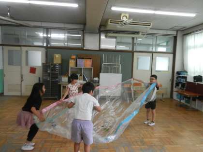 透明のビニール袋にみんなで絵を描いて、大きなバルーンを作りました。