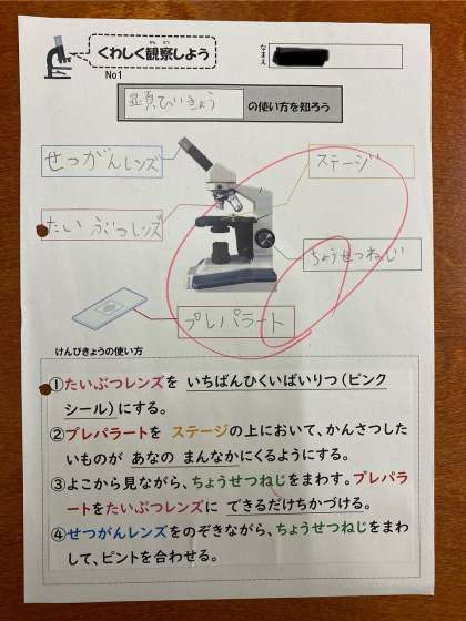 プレパラート、対物レンズ、ステージ、調節ねじ・・・