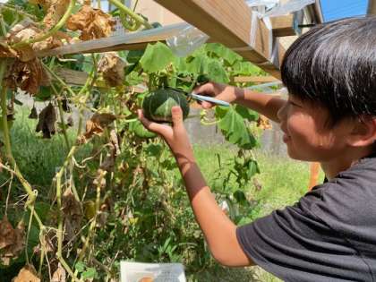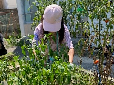 夏休みの間に収穫をむかえた野菜もあり、学校にきてくれた若草学級のお友達。