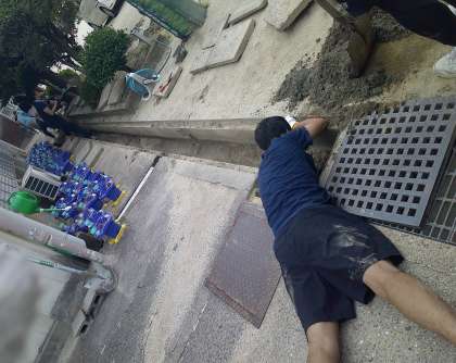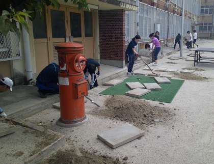 コンクリートの重いフタを持ち上げるだけでも重労働ですが(砂が噛んで簡単には上がりません!)、そこは力のある男性教員が大活躍。みんなで協力して、側溝の砂を上げていきます。これで、しばらくは運動場の水はけも良いことでしょう。でも、元通りにフタを戻すのがまた大変で・・・。