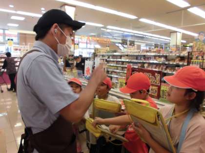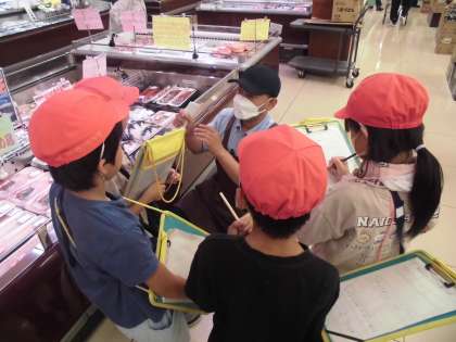 「なぜスーパーで買い物する人が多いんだろう」という学習課題を解決するために、お店の人や、お客さんに質問をしていました。
