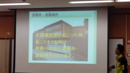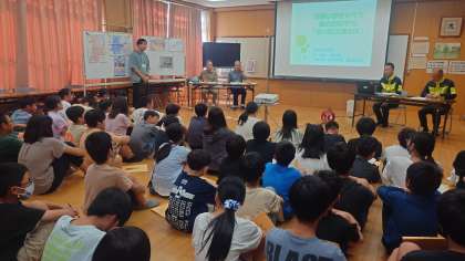 区役所の防災担当の方、地域の自主防災会・水防団の方に来ていただき、お話を聞きました。淀地域の防災の取り組みや淀地域の災害・防災の歴史などについて詳しく教えていただきました。一人ひとりが自分事として話を聞き、次の学習につなげようという意欲がみられました。