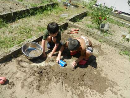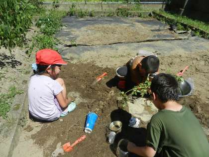 いつもは野菜を育てている若草の畑で、土や水を思いっきり使って遊びました。