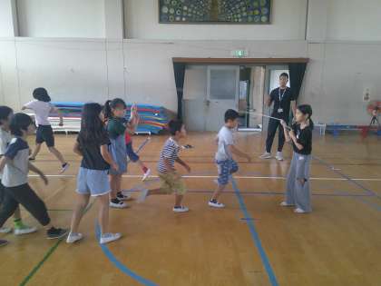 京都市教育委員会の体育健康教育室では、低下傾向にある子どもたちの体力の向上を目指して、スポーツチャレンジ大会というものを実施しています。今回の種目はおおなわとび(8の字)で、3分間で跳べた回数を競い合うものです。1チームの人数制限はなく、参加は児童の意思に任されているため学級の全員でというわけではありませんが、このスポーツチャレンジには多くの小学校が参加をし、他校と順位を競い合っています。