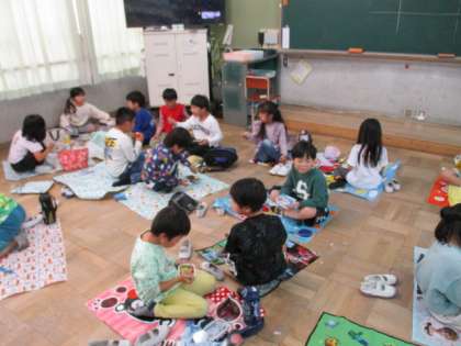 楽しみにしていた遠足が延期になってしまいました。がっかりする1年生の子どもたち。少しでも遠足気分を、と教室でシートを敷いてお弁当を食べました。狭い教室の中ではありましたが、いつもと違う雰囲気での昼食に大喜びの子どもたち。友達と楽しくお弁当を食べていました。次こそは晴れますように!!