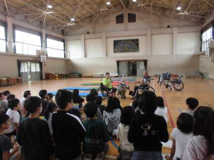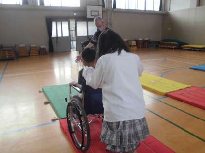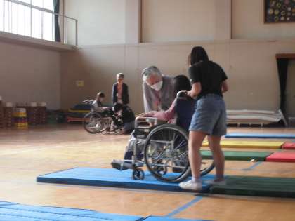 障害のある方のお話をお聞きして、実際に車いすにのったり、補助したりと車いす体験をしました。