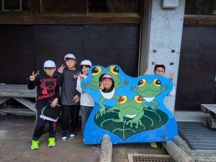 花背山の家 『いい写真が撮れました・・・編』 公開日 2024/11/05 更新日 2024/11/05 5年生 撮影スポットです。観光地でも遊園地でも、こういうのがあると写真を撮りたくなりますよね〜。カエル君の口から顔も出して、はいチーズ!!