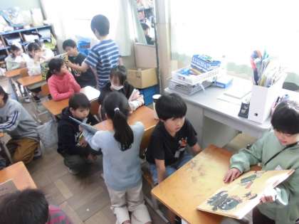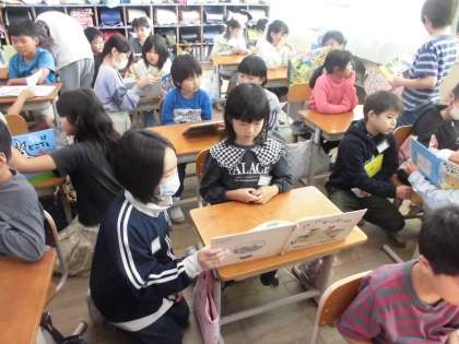1109【4年生】たてわり読書 公開日 2024/11/19 更新日 2024/11/19 4年生 読書週間のたてわり読書で2年生に読聞かせをを行いました。 去年までは上級生に読み聞かせをしてもらっていた立場から、読聞かせをする側になり、お兄さん、お姉さんとしてしっかりと読み聞かせをしていました。立派です。