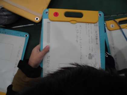 2年生と一緒に人権集会をしました。『ドッジボール』というお話をもとに「友達と仲良くするためにはどうしたらよいか。」を考えました。いつもの道徳の時間は自分の教室での学習ですが、今日は考えたことを2年生に伝えたり、2年生の考えを聞いたりすることができました。なかなか考えがまとまらない1年生に対して2年生がお話の内容を分かりやすく教えてくれたり、考えるヒントをくれたりする場面もありました。最後に「仲間外れをせず、みんなで仲良くするためにはどんなことができるか」を考えました。「優しく言葉を話す。」「人のこと(気持ち)を考える。」「人の好き嫌いをなくす。(人によって態度をかえない。)」といった自分の考えを書いていました。