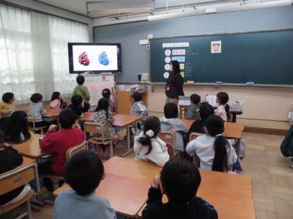 食の学習をしました。今日のテーマは「おいしいを見つけよう」です。味には甘さ・しょっぱさ・すっぱさ・苦さなどがあることを確認し、普段どこでそういった味やおいしさを感じているのかを考えました。食べているのだから当然「口」だと思っていましたが、いろいろ試してみると・・・実は「目」や「耳」「鼻」でもおいしさを感じているということが分かりました。これからもいろいろな食材・料理に出合い、おいしさを知ってほしいと思います。