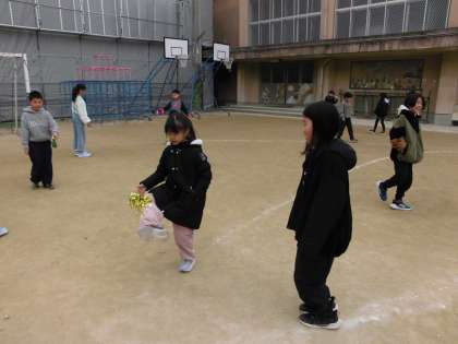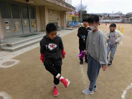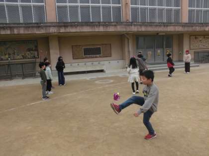 道徳の学習で韓国・朝鮮の知っていることや、地図上の場所を確認しました。その後、韓国の遊びである「チェギチャギ」をしました。これはサッカーのリフティングのようなもので、苦戦していましたが、「6回できた!」や「屋根ぐらいまで上がった!」など楽しんでいる姿が見られました。