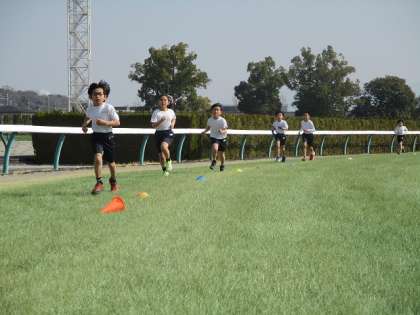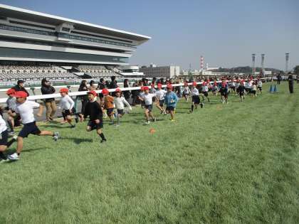 京都競馬場様のご厚意で、レースの時に実際に競走馬が走るコースを本校の児童が走りました。日本中で、こんなふうに走ることができるのは明親小学校だけだそうです。明親小学校の学校自慢の一つです。