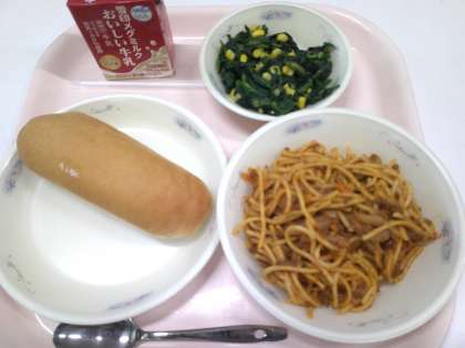 今日から給食が始まりました。1年生にとっては初めての給食です。今日のメニューは写真の通り、おいしそうなスパゲッティ。