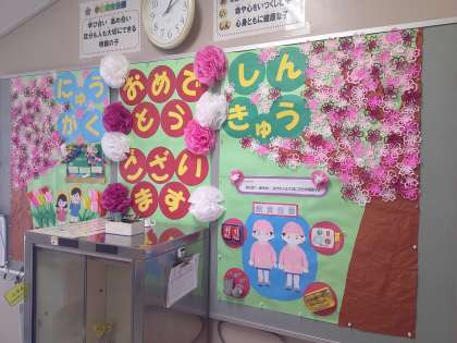 本校では、給食調理員が季節に合った掲示物を毎月つくってくれています。旬の食材や、昔から伝わる行事、四季を感じる風景など、様々な工夫が凝らされています。今回は、年度始めということで、学校教育目標や校歌まで盛り込まれています!