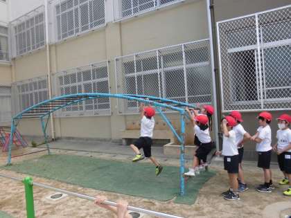 2年生になって初めての体育の学習をしました。チャレンジャーやジャングルジム、うんていなどの遊具の安全な使い方を学習しました。チャレンジャーは前年度の工事で使えなかったため、久しぶりに遊ぶことができました。こわごわのぼっている子もいましたが、楽しく遊べました。