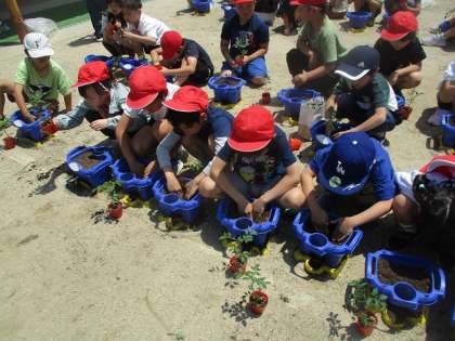 生活科でこれから育てるミニトマトの苗を植えました。植木鉢の土を入れ替え、苗をそっと植えました。地域の女性会の方々にも手伝っていただきました。1年生の時にはあさがおやチューリップを育ててきました。そういった学習も生きているのか、みんなとても上手に植えることができました。生活の学習では、どうやったらたくさんおいしいミニトマトが育つかを話し合ったり、生長の様子を観察したり、お世話をしたりしていきます。どのように育っていくか楽しみですね。