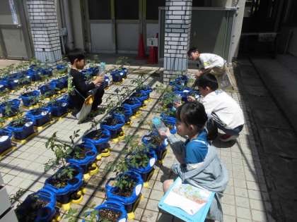 先日植えたミニトマトの観察をしました。短い期間でぐんと茎が伸びた様子に驚いたり、葉の数が増えたことを喜んだりするなどしていました。茎や葉の様子に加え、「たくさんミニトマトができたらいいな。」「おいしいミニトマトができるようにしっかりお世話をします。」などの思いもカードに書いていました。頑張ってお世話をしてほしいです。