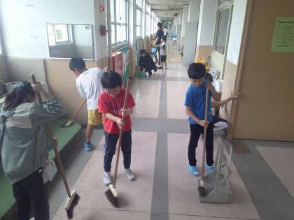 お世辞にも綺麗とは言い難い明親小学校ですが、だからこそ掃除のし甲斐もあるというものです。各自が掃除道具を手にし、思い思いの場所を掃除しました。