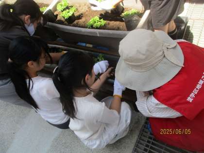 作業では、女性会の方々から植え方のコツを教えていただきながら、子どもたちが一つひとつ丁寧に苗を植えていきました。少し緊張しながらも、楽しそうに取り組む姿が印象的でした。