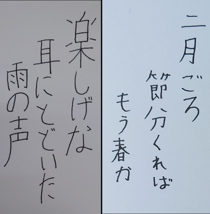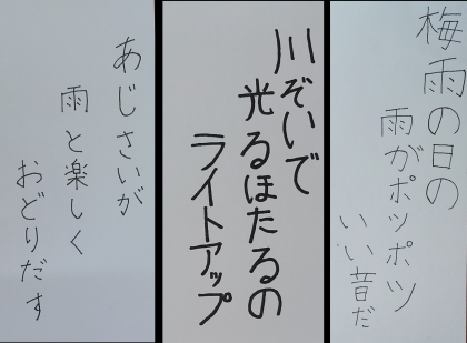 「五音・七音・五音」の十七音で、「季語」を入れてよむのが「俳句」なのだということを学習して、俳句を作りました。時期的に「梅雨」なので「雨」や「梅雨」に関連した俳句が多かったのですが、いろいろな季節における自分の日常をよむことができました。