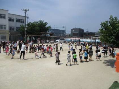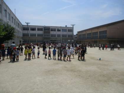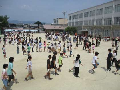 この日の中間休み、全校児童による「大縄大会(8の字跳び)」が運動場で行われました。