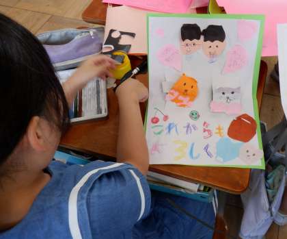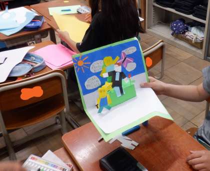 カードを開くとメッセージや飾りが飛び出してくる仕掛のあるカードを作りました。どの子も相手のことを思い浮かべながら、楽しそうに作っていました。