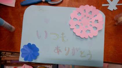 家族や友だち、お世話になった方へ、感謝のカードを作ったり、友だちが頑張っていることへの応援カードを作っている子もいました。作り始めた時期が父の日が近い時期だったこともあり、お父さんへの感謝のカードを作っている子もいました。