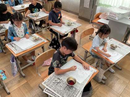 できた色水を半紙に染み込ませて、折り紙のように折った半紙を広げて偶然できた柄を楽しんだり、綿棒に色水をつけてお絵かきをしたりしました。それぞれに工夫しながら、楽しむ様子が見られました。