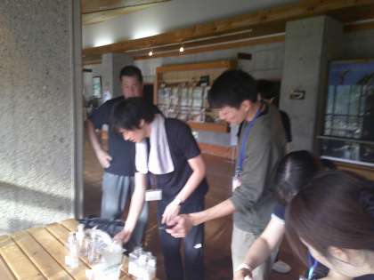 入浴に向けて、シャンプーやボディーソープをセッティング中の引率教職員の面々。子どもたちがスムースに活動できるよう、休む間もないくらいみんな大忙しです。