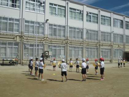 運動場に出て練習をしています。隊形をいろいろに変えながら踊る練習をしています。列や間隔をそろえたり、ふりをそろえたりと本番に向けて練習することはたくさんです。いよいよ明日は一週間前です。頑張ります!