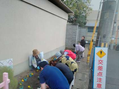 女性会の皆様には、年に2回こうして花壇やプランターの植え替えを行って頂いています。花の株も女性会よりご提供頂いています。