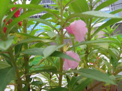 ホウセンカは,ピンク・赤・薄いピンク・紫と色とりどりに咲き誇っています。好きな色の花が咲いた子は,大喜びでした。葉が60枚を越えて,ノートへの記録は大変でしたが,花が咲いて,その苦労も吹っ飛びました。