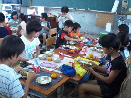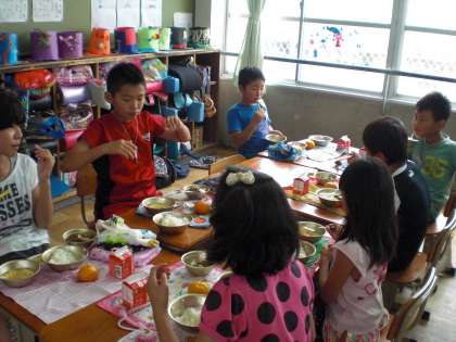 今日は,「なかよし給食」の日です。全校児童が,なかよしグループに分かれ給食を食べました。献立も,みんなが大好きな「焼肉」でした。いつもの給食時間とは違うメンバーでちょっぴり緊張しながらも,楽しく給食をいただきました。