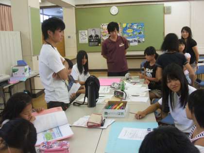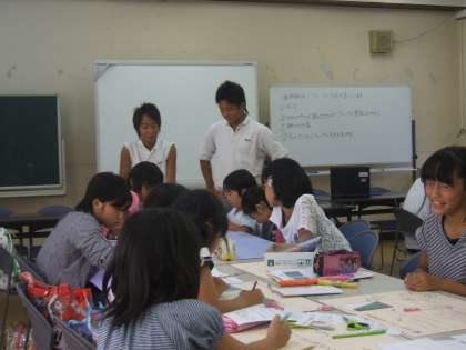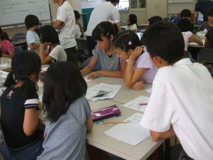 7月27日(金),午後1時から大淀中学校で小中生徒会・児童会交流会が行われました。明親・美豆の児童会計画委員の5・6年生が大淀中学校へ行き,大淀中の生徒会の子どもたちと一緒に環境問題についてのグループワークに取り組みました。初めは緊張していた子どもたちも,中学生がやさしくサポートしてくれて,しだいに笑顔が多く見られるようになっていきました。この日子どもたちがまとめたものは,9月の児童集会や掲示板で全校児童に知らせる予定です。