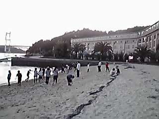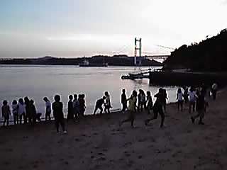 瀬戸大橋が見える砂浜で、貝殻を拾ったり、石を投げたり…。