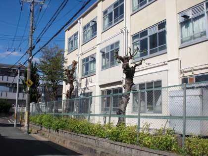 南校舎の道路側にある,桑,欅,桜の木の枝が伸びていました。特に真ん中の桑の木の枝はフェンスから出て,電線や電話線に被さろうとしていました。そこで,教育委員会を通じて造園業者に剪定してもらいました。おかげで大変すっきりとしました。