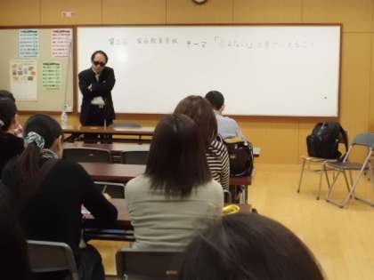 今日は,第2回家庭教育学級として,「見えない」世界で生きる,というテーマで,京都府視覚障害者協会副会長の松永信也先生の講演会が開かれました。ご自身の体験から視覚障害について分かりやすく,心に響くお話をしていただきました。失明を乗り越え今に至るリアルな体験談や執筆されている本のお話など,しんどいこともユーモアを交えてご講演くださいました。聴く者に勇気を与えてもらえる,とても素晴らしい時間でした。