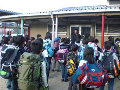 本日より2泊3日で,4年生が「みさきの家」での野外活動に出発しました。1名の欠席も無く,全員元気に参加できました。写真は,出発式の様子です。