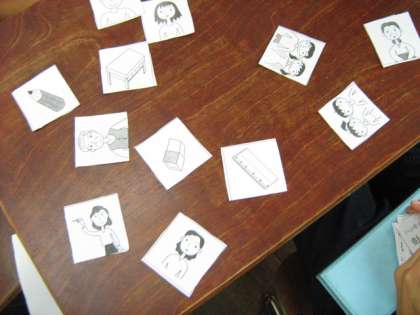 最初にカードを見ながら家族や学校に関係のある言葉をみんなで発音しました。
