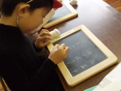 昔のノートと鉛筆である「石板」と「石しつ」という物の体験もしました。