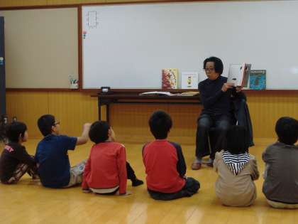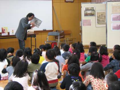 また26日・28日の両日は,日本国際児童図書評議会会員であり,元京都女子大学附属小学校教諭の“おおいし すすむ”先生をお迎えして,学年毎に読み聞かせやブックトークをしていただきました。